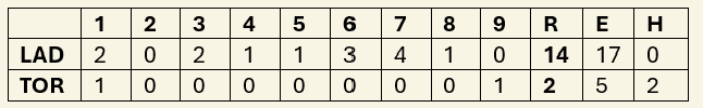 Ohtani was the first Dodger in the batters box and he was greeted with boos from the Toronto crowd. He was out in 3 pitches, put out on a ball hit short to right centre. Fourth batter of the inning, Teoscar Hernández, sent it yard, bringing home Kyle Tucker on a 2 RBI homerun.