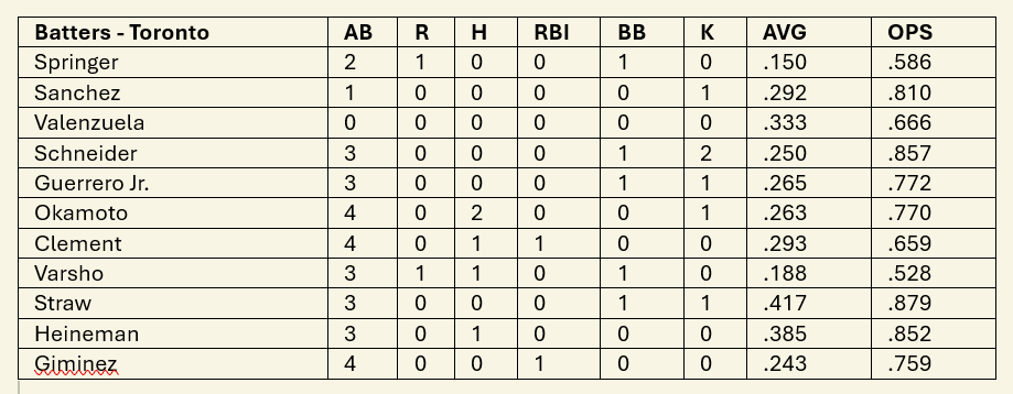 George Springer walked in his first at-bat. With Kazuma Okamoto on first Ernie Clement, facing two outs, brought Springer home with a base hit. Dalton Varsho was walked, loading the bases. Miles Straw, 5 for 9 batting this season, grounded to second for the third out.